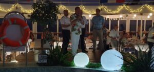 Der Kreuzfahrtdirektor und der Kapitän halten eine kurze Rede.